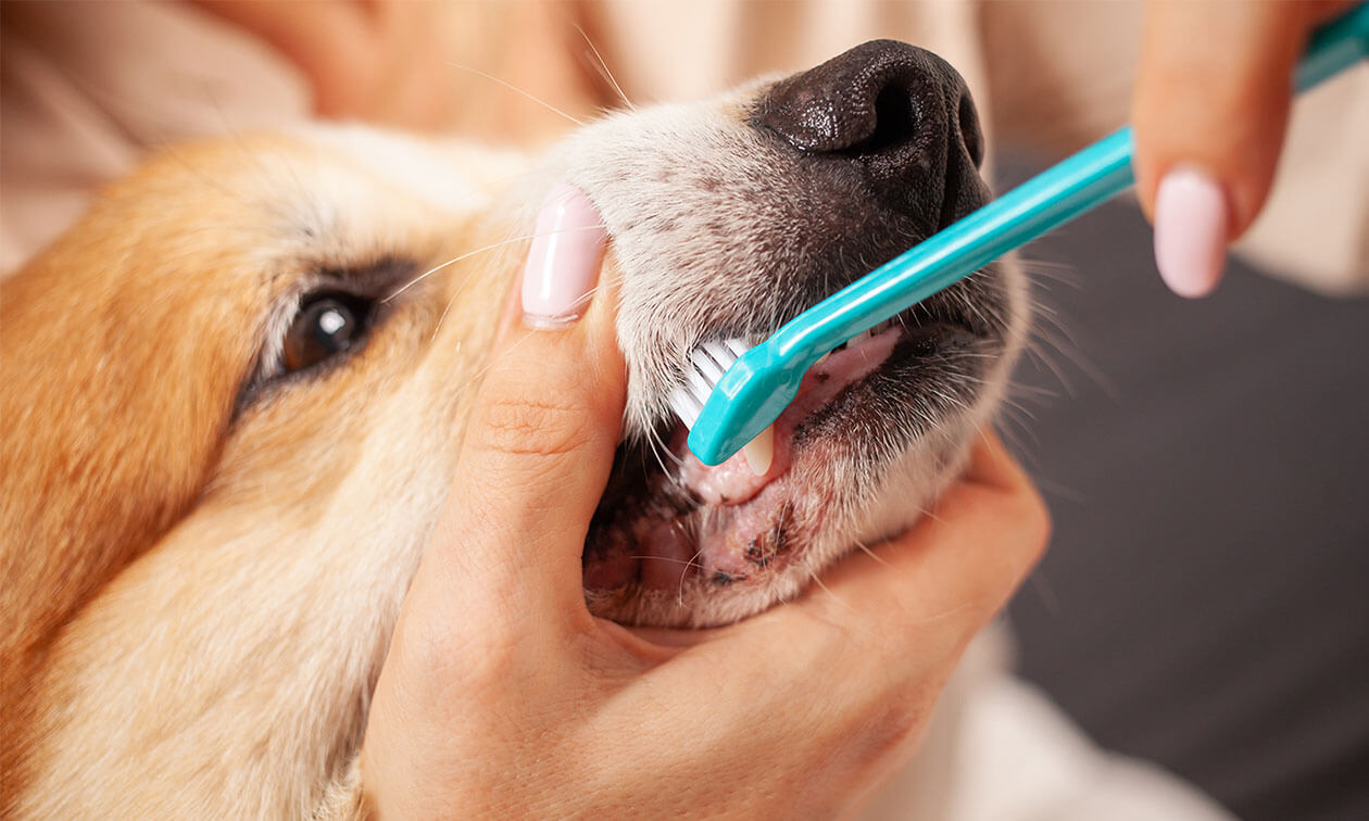Holding the toothbrush at a slight angle and using light pressure, brush your dog's teeth from front to back or in a circular pattern. If you notice their gums becoming irritated or bleeding, you may be brushing too hard or a dental issue may be present. Talk to your vet to make sure you are on the right track with your at home dental care.