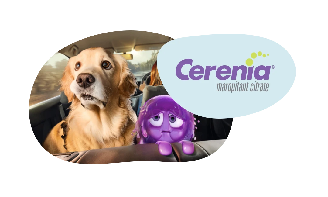 Important Safety Information: Use CERENIA Injectable subcutaneously for acute vomiting in dogs 2 to 4 months of age or either subcutaneously or intravenously in dogs 4 months of age and older. Safe use has not been evaluated in dogs with gastrointestinal obstruction, or those that have ingested toxins. Use with caution in dogs with hepatic dysfunction. Pain and vocalization upon injection is a common side effect. In people, topical exposure may elicit localized allergic skin reactions, and repeated or prolonged exposure may lead to skin sensitization. See full Prescribing Information.